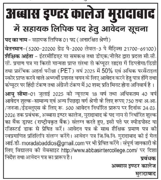 Established in 1938, ABBAS INTER COLLEGE is a Pvt. Aided institution located in the urban area of Moradabad City Girls block, Moradabad district, Uttar Pradesh. The school provides education from Class 1 to 12 and follows Hindi as the medium of instruction.